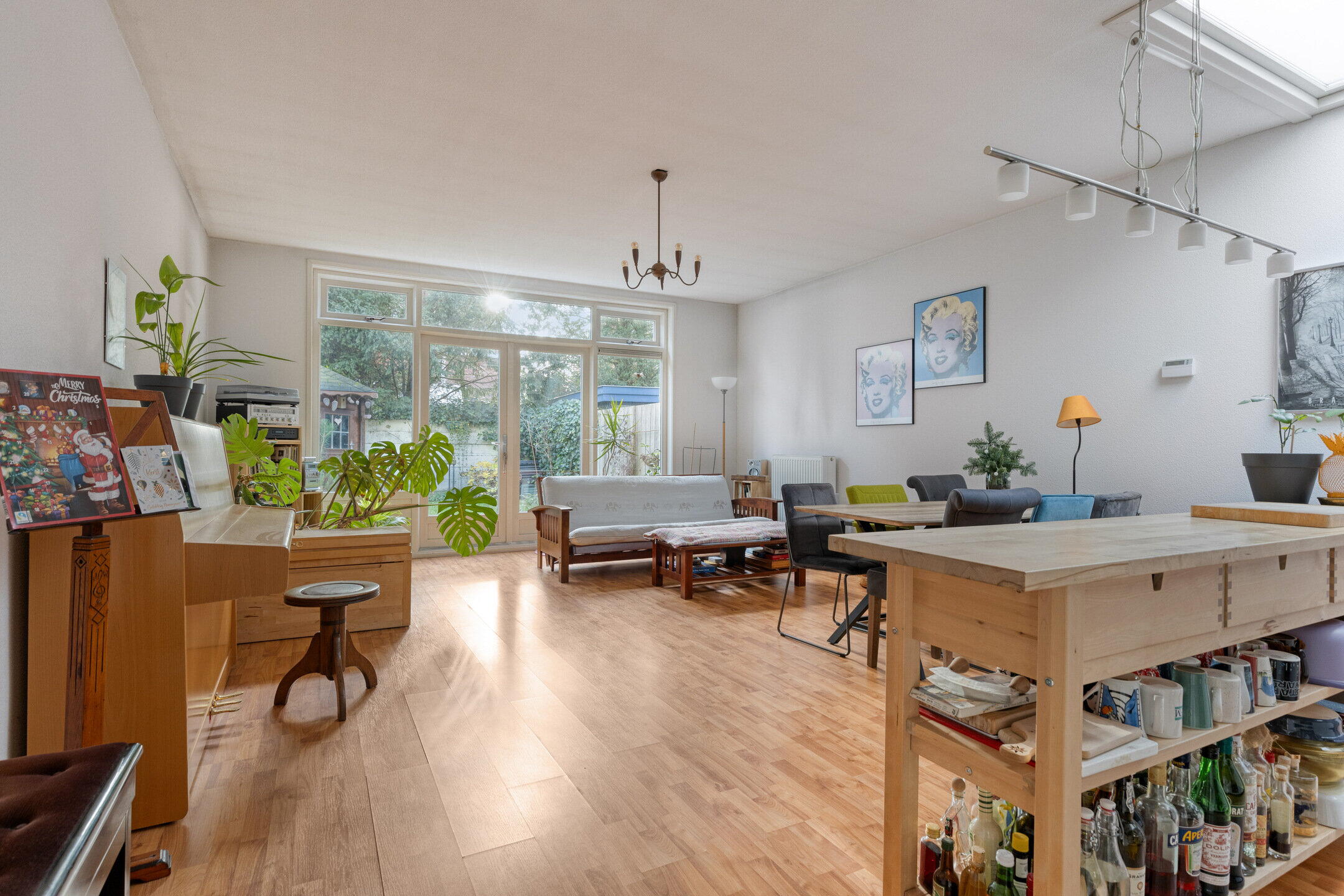 De woning eindigt in de lichte woon-/eetkamer aan de achterzijde. Er is voldoende ruimte voor een zithoek en een eethoek. De open keuken is praktisch opgesteld met voldoende werk- en kastruimte. Vanuit de woonkamer is er toegang tot de tuin, wat zorgt voor veel lichtinval en een prettige verbinding met buiten.