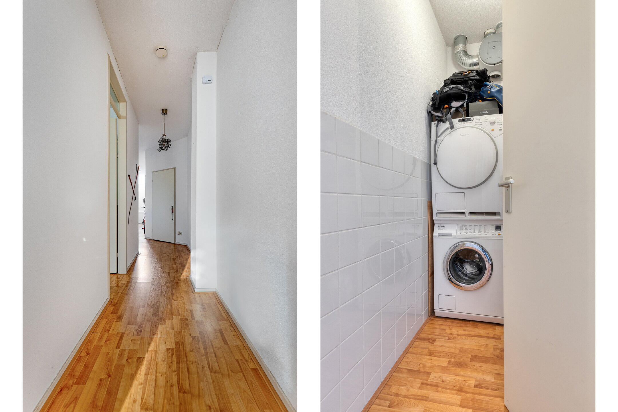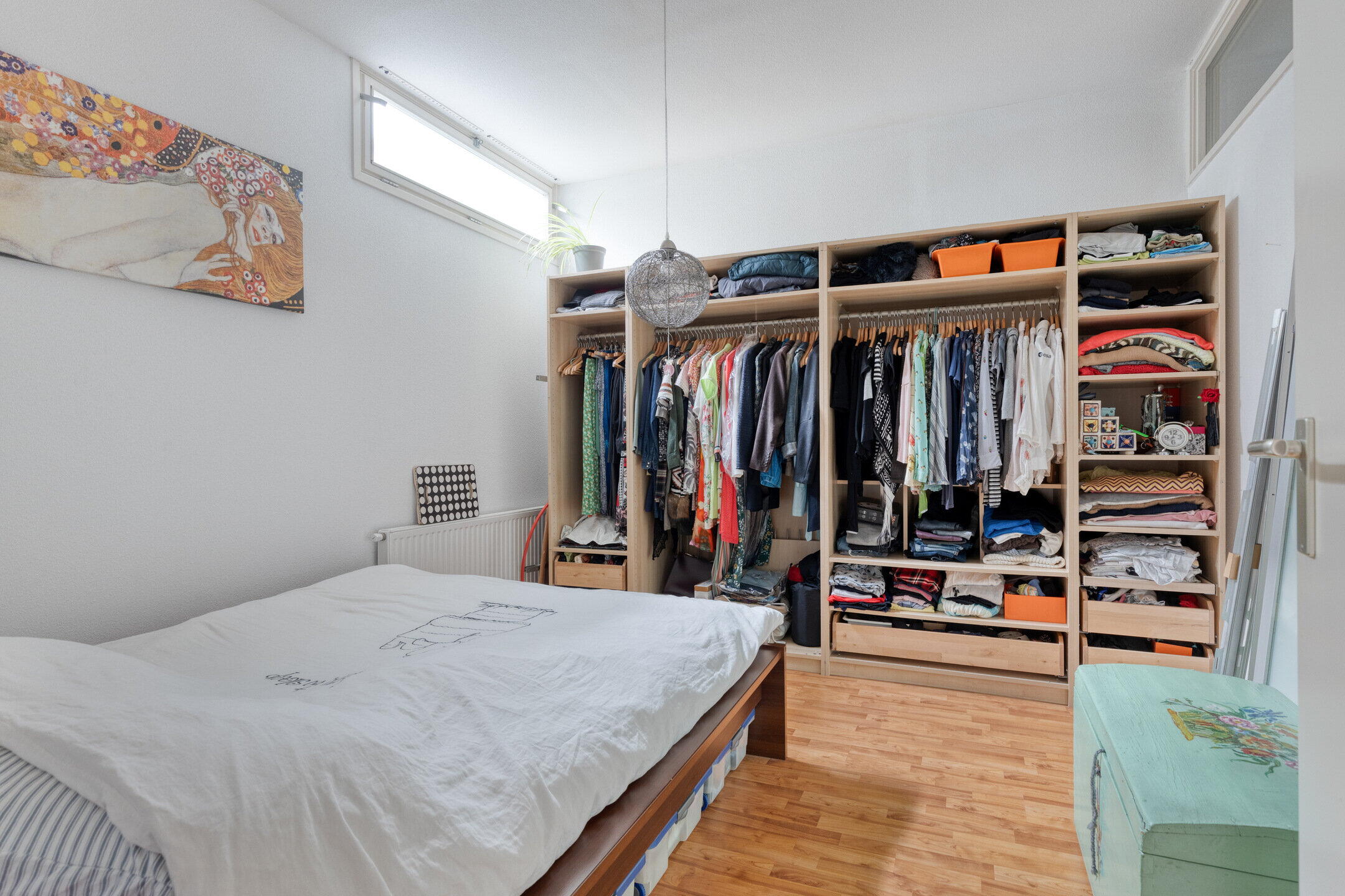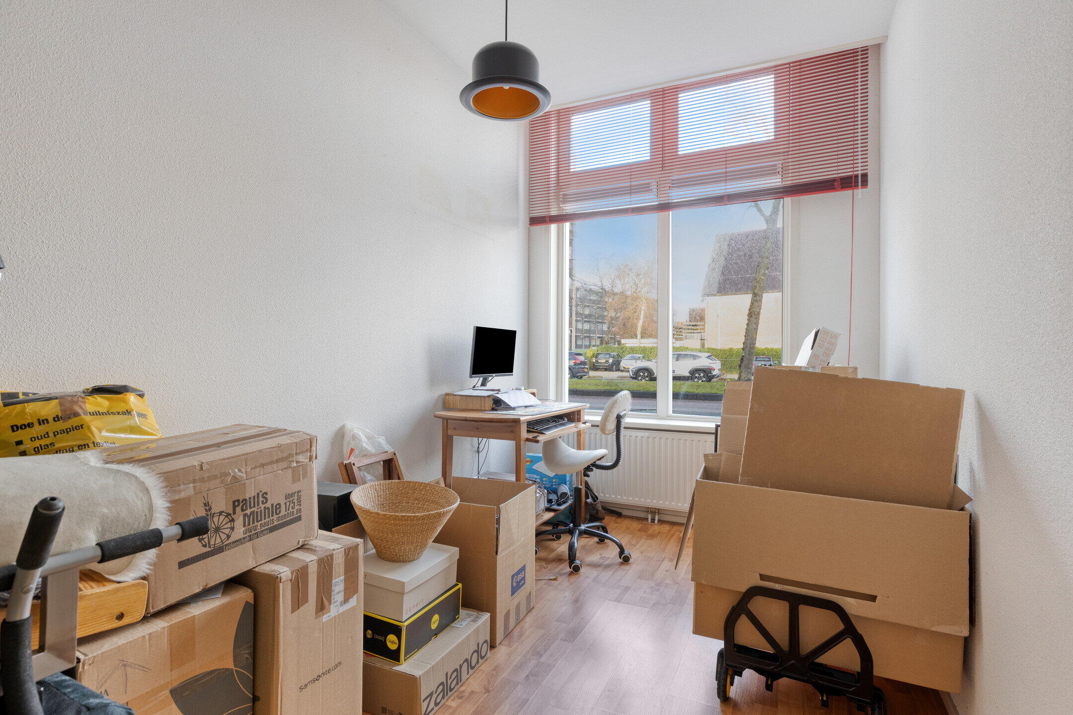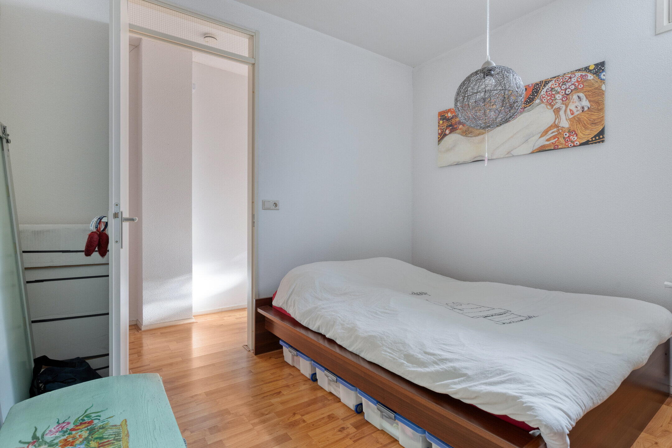 Aan de voorzijde van de woning ligt de eerste slaapkamer, van goed formaat en geschikt als hoofdslaapkamer, logeerkamer of werkruimte. Aangrenzend bevindt zich de berging met aansluitingen voor wasapparatuur en extra opslagruimte.