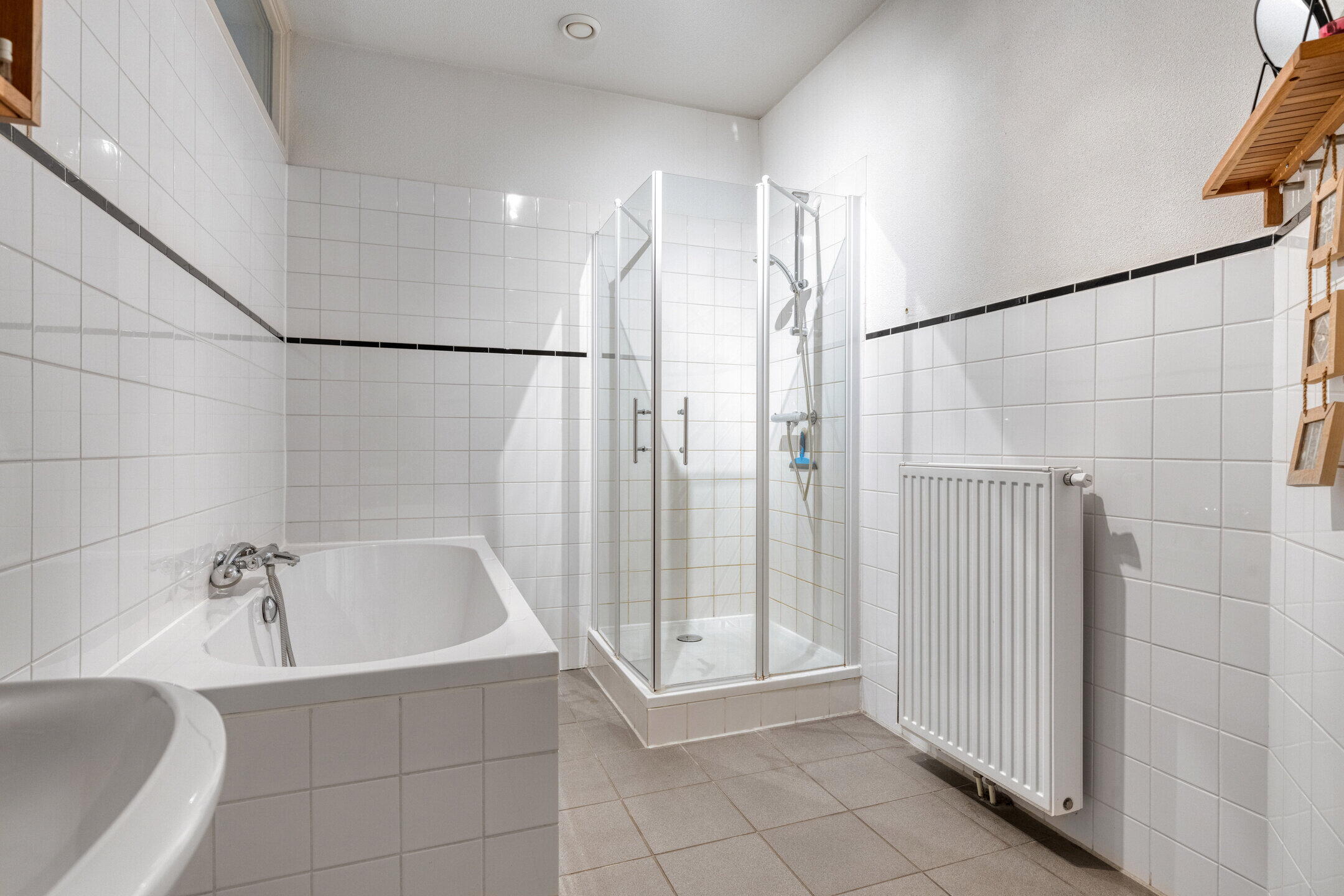 Vanuit de hal is de badkamer bereikbaar. Deze is ingericht met een ligbad, douche en wastafel.