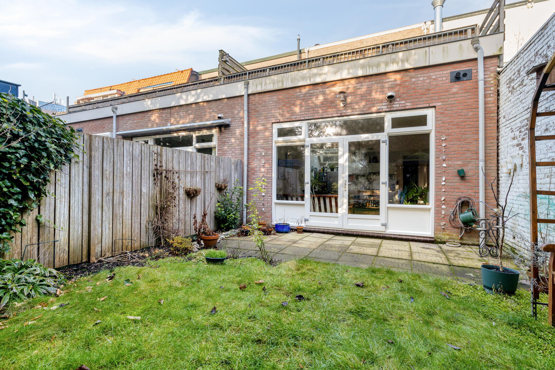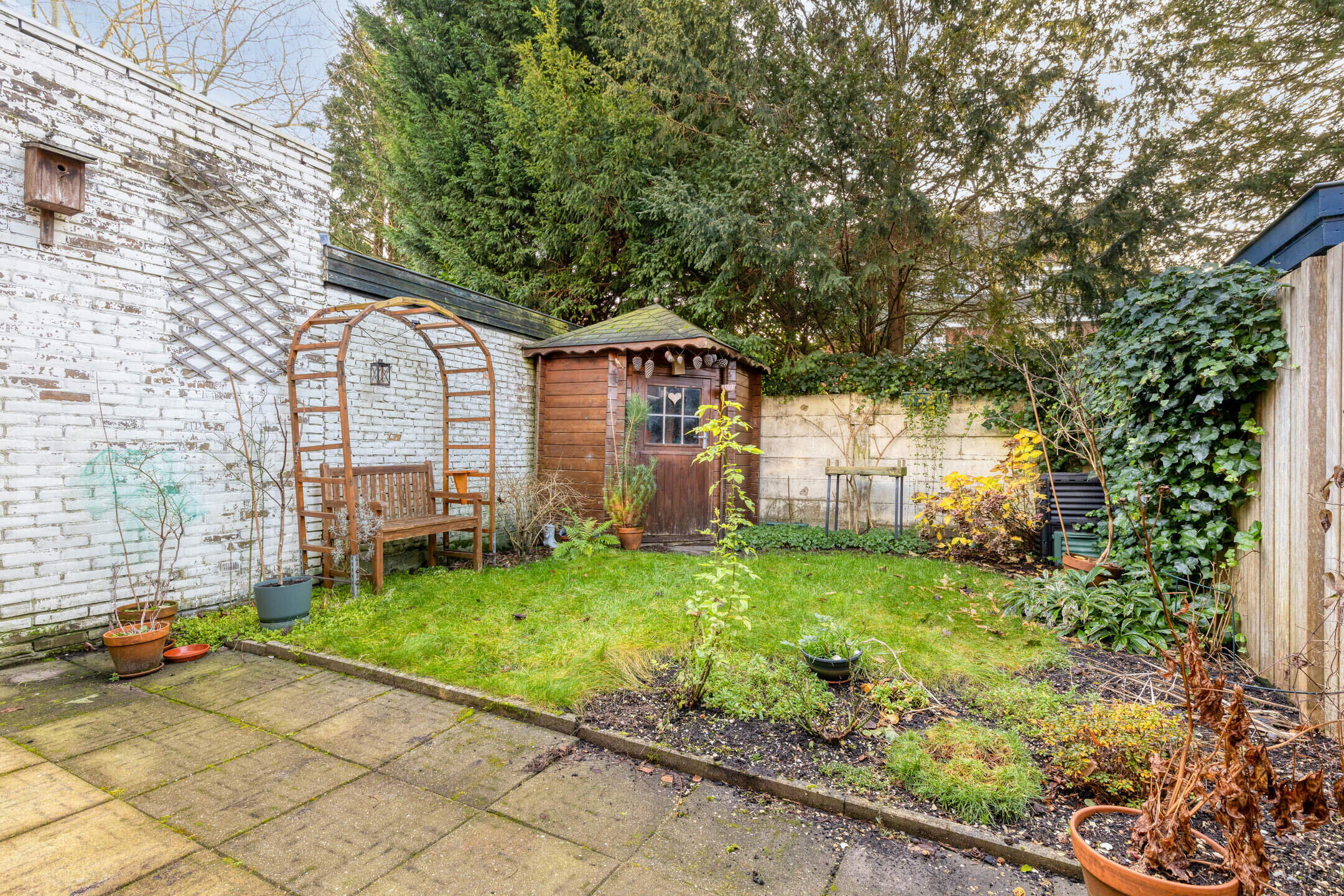 Via de woonkamer bereik je de achtertuin. De tuin is verzorgd aangelegd met een combinatie van bestrating en groen. Achter in de tuin staat een houten berging, geschikt voor fietsen en tuingereedschap. De tuin biedt veel privacy en is een fijne plek om buiten te zitten.